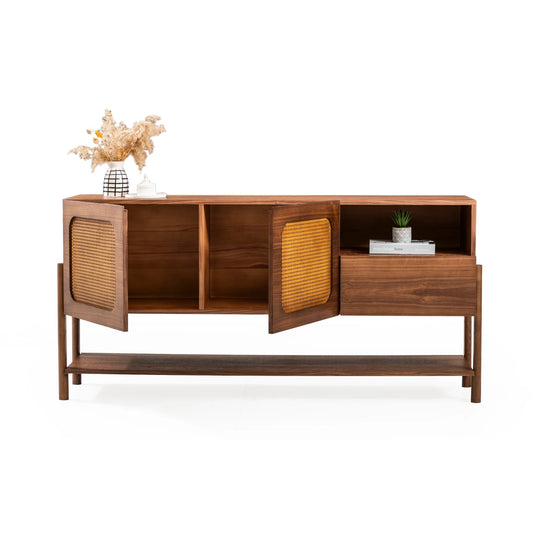 Rattan TV Sehpası Ahşap Gövde Masif Ayak