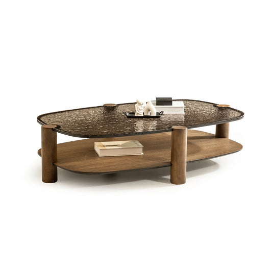 Üst yüzeyindeki damlacıklı cam, suyun akışını ve doğal oluşumlarını hatırlatır. Camın içinde donmuş gibi görünen her damla, nehrin durduğu anlardan birini yansıtır. Alt bölümde kullanılan bronz tonları, kaplangözü taşının sıcaklığını ve ışıkla değişen yapısını çağrıştırır.